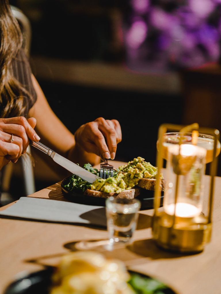Smashed avocado on toasted sourdough with two poached eggs, topped with chilli flakes, lemon, & fresh herbs, served with mixed greens (VE & GF option available)